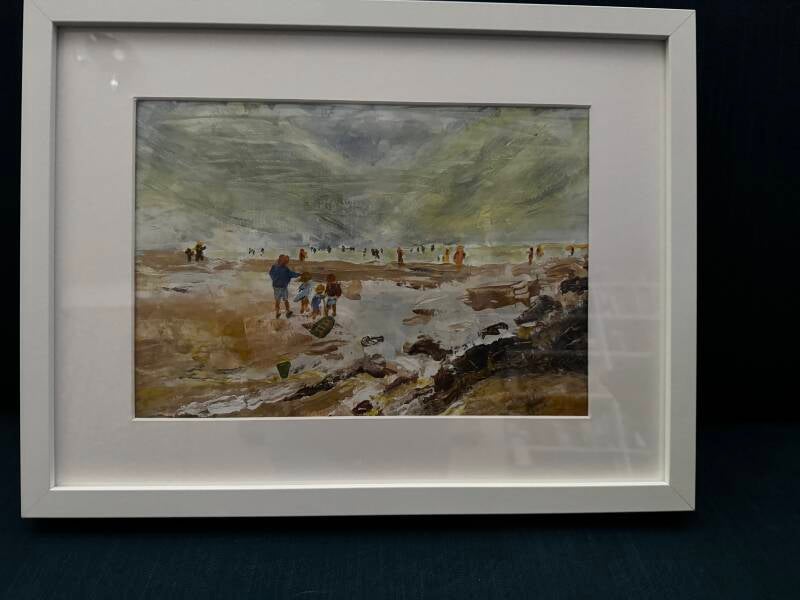 🔴 SOLD HAMPSHIRE: Family time at the beach. Mounted & framed acrylics on paper. Original ©Peta Butcher 2023
