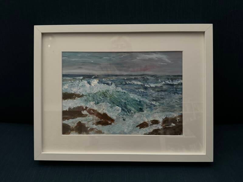 "On the rocks". Oil pastels on board unframed. Original for sale £85.00.